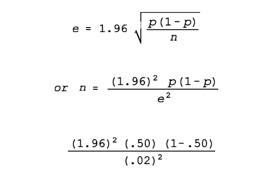 "p" when is assumed to be 50 percent. The computation is as follows (where "e” is the desired precision level. 2 percent in this example), so n = 2,401 or approximately 2,400 cases.