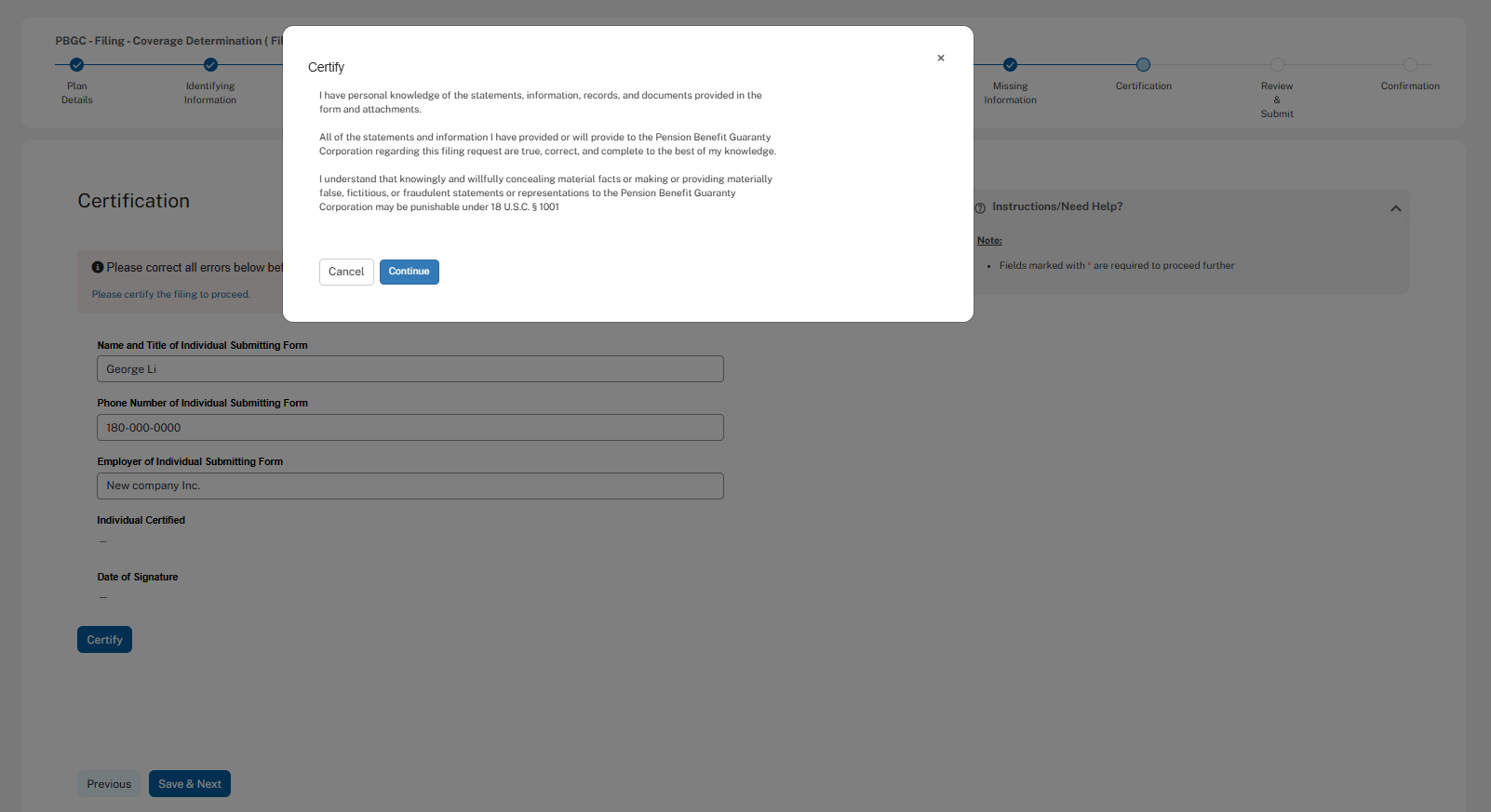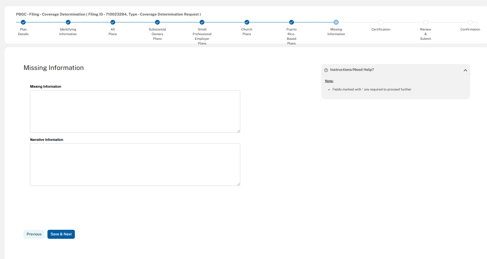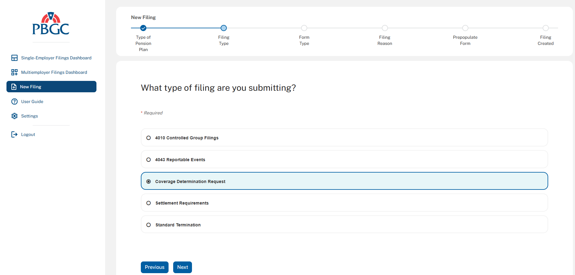 The following screenshots demonstrate what the coverage determination filing module in PBGC’s e-Filing Portal will look like.