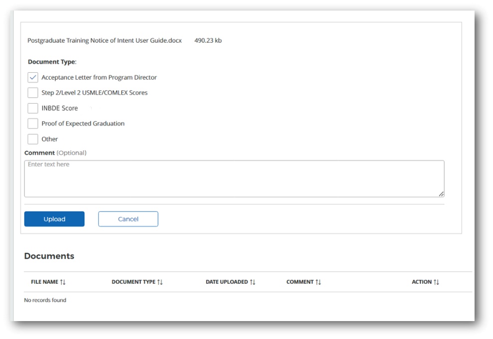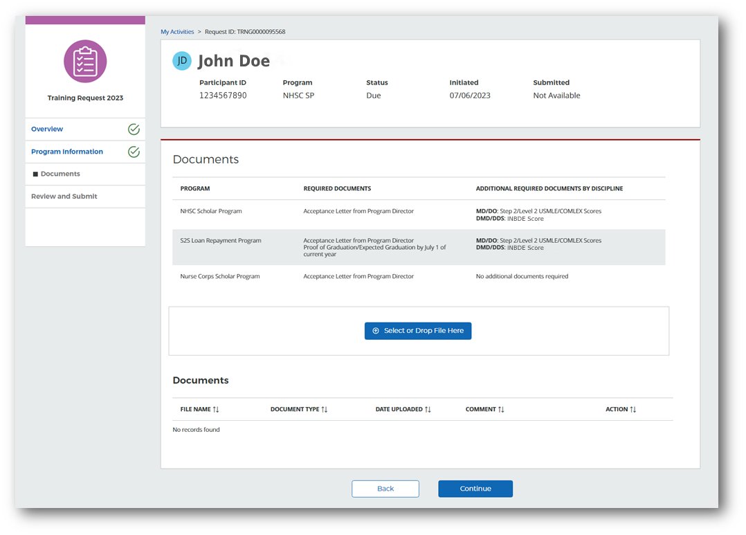 On the Documents page, participants can upload any supporting documents as needed. Any required documents associated with the training request will be noted as such in this section.