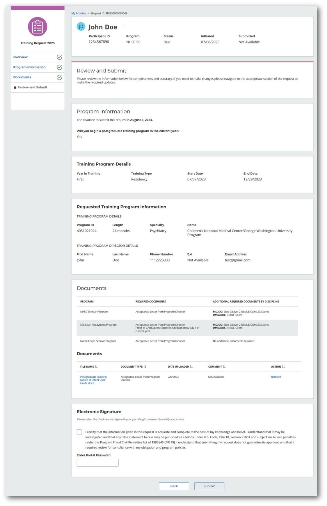 The Review and Submit page allows participants to review responses provided in the previous sections of the postgraduate training request application prior to submitting the request.