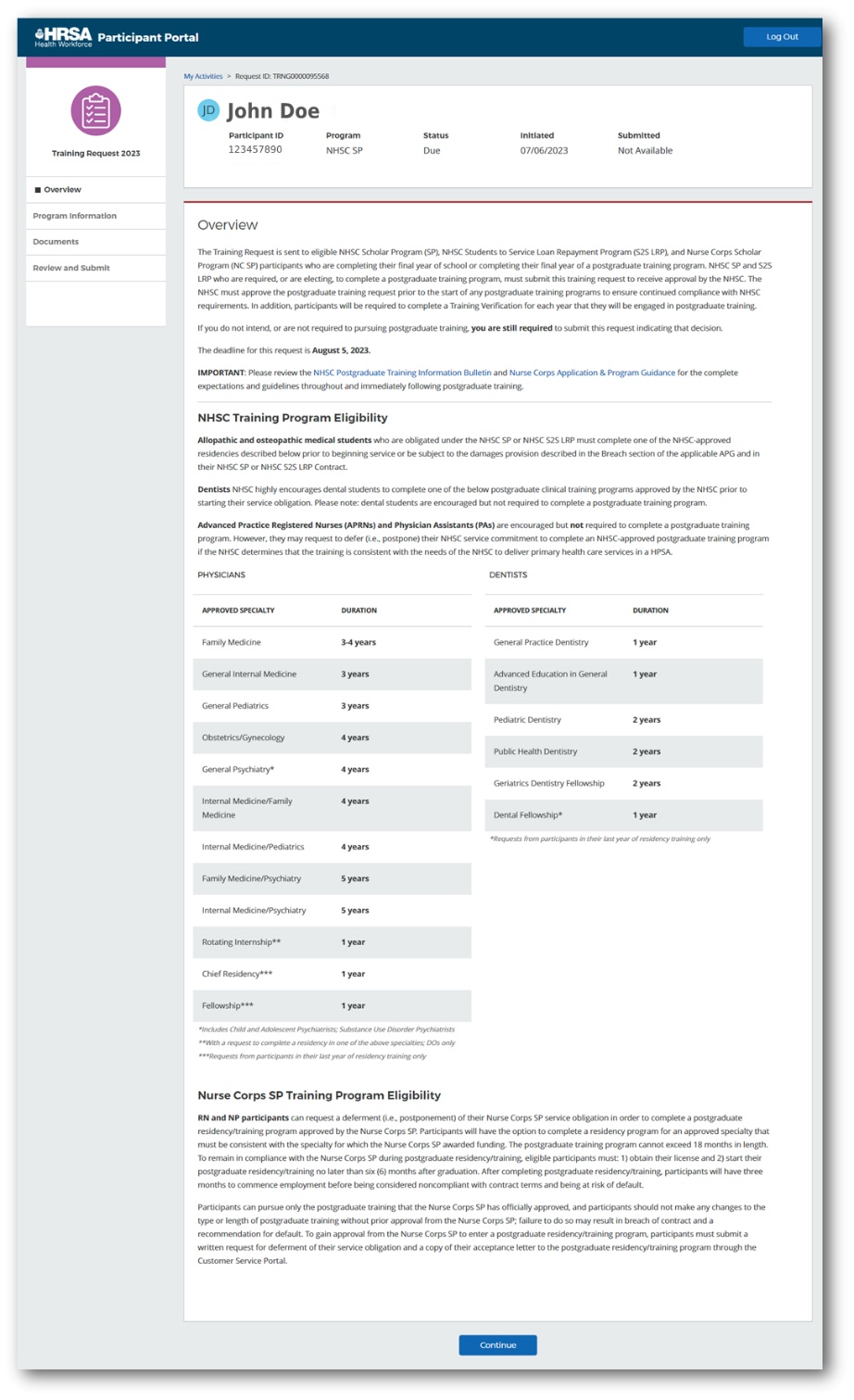 The Overview page gives participants a detailed summary on the purpose of the Postgraduate Training Request. The page also provides general information on the postgraduate training, training program eligibility, and request submission deadline. It also contains links to the latest NHSC Postgraduate Training Information Bulletin and Nurse Corps Application & Program Guidance.