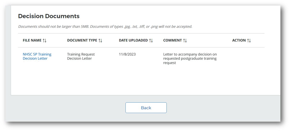 To access the decision letter, navigate to the “Decision Documents” table on the “Review and Submit” page of submitted Postgraduate Training Request which will be located in Closed Activities table on “My Activities” page.