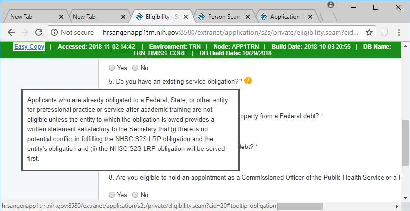 Section 1 Eligibility – Tool Tips and Drop Downs