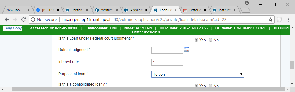 If a loan is under Feceral court judgement, then Date of judgement field will appear