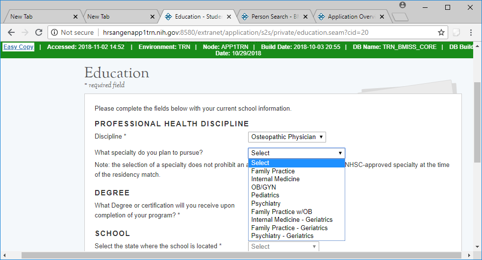 Drop Down selections for Osteopathic Discipline