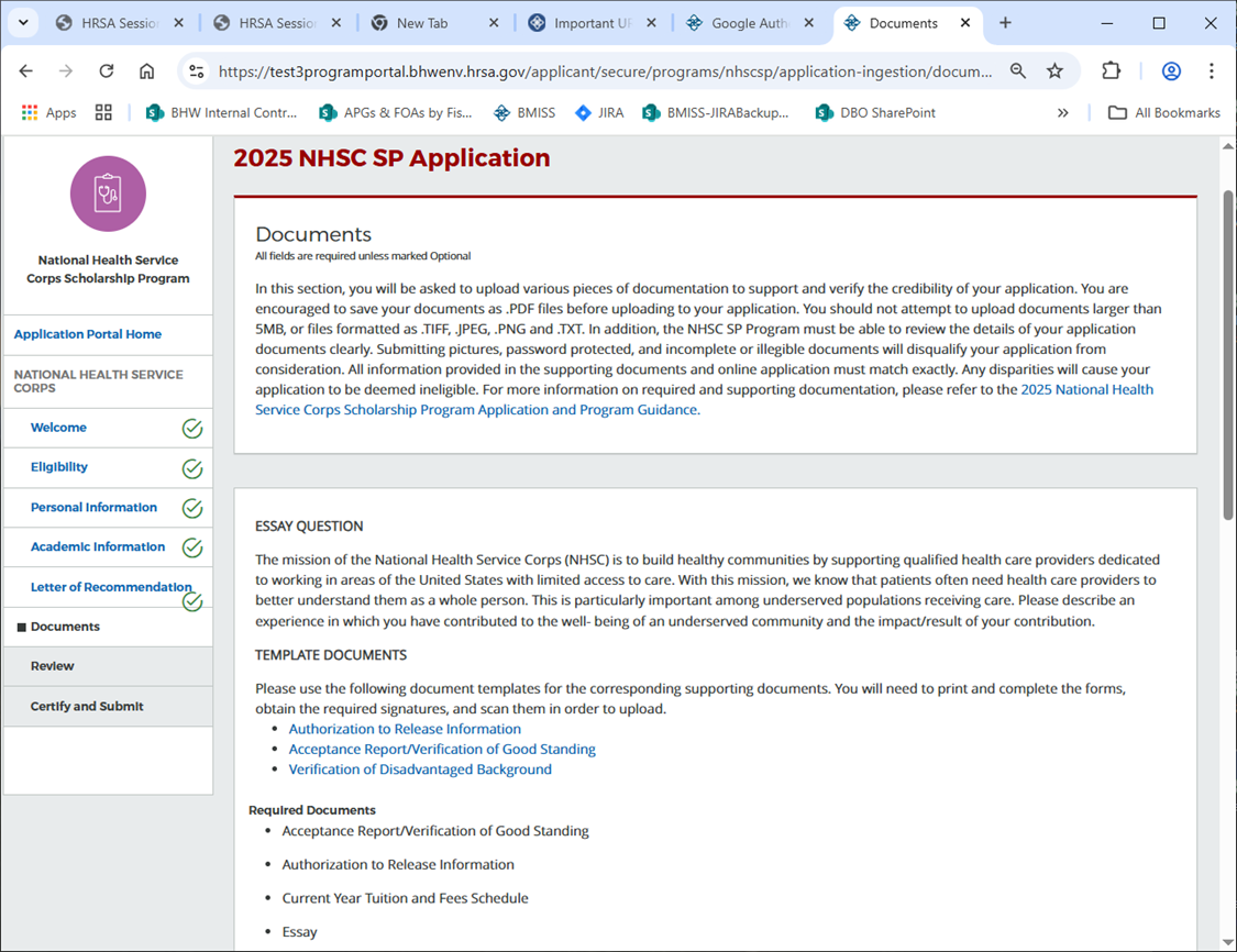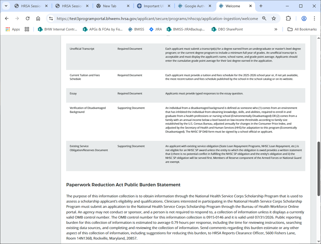 Public Burden Statement: The purpose of this information collection is to obtain information through the National Health Service Corps Scholarship Program (NHSC SP) that is used to assess a scholarship applicant’s eligibility and qualifications. Clinicians interested in participating in the NHSC SP must submit an application to the NHSC SP. An agency may not conduct or sponsor, and a person is not required to respond to, a collection of information unless it displays a currently valid OMB control number. The OMB control number for this information collection is 0915-0146 and it is valid until xx/xx/xxxx. This information collection is required to obtain or retain a benefit (NHSC SP: Section 338A of the Public Health Service Act and Section 338C-H of Public Health Service Act.). The information is protected by the Privacy Act, but it may be disclosed outside the U.S. Department of Health and Human Services, as permitted by the Privacy Act and Freedom of Information Act, to Congress, the National Archives, and the Government Accountability Office, and pursuant to court order and various routine uses as described in the System of Record Notice 09-15-0037. Public reporting burden for this collection of information is estimated to average xx hours per response, including the time for reviewing instructions, searching existing data sources, and completing and reviewing the collection of information. Send comments regarding this burden estimate or any other aspect of this collection of information, including suggestions for reducing this burden, to HRSA Reports Clearance Officer, 5600 Fishers Lane, Room 14NWH04, Rockville, Maryland, 20857.