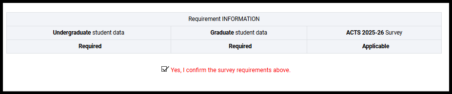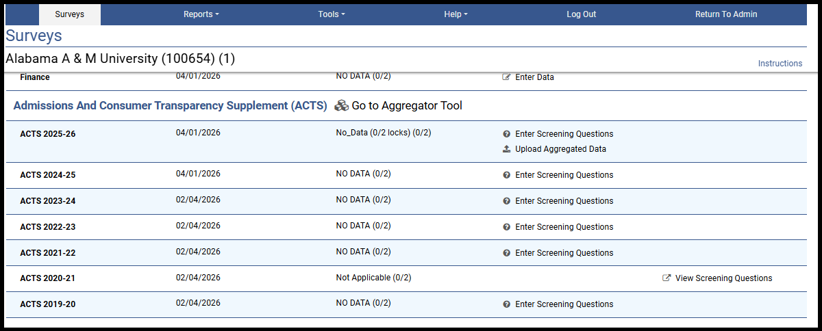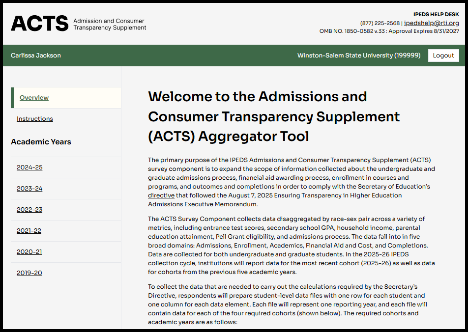 The primary purpose of the IPEDS Admissions and Consumer Transparency Supplement (ACTS) survey component is to expand the scope of information collected about the undergraduate and graduate admissions process, financial aid awarding process, enrollment in courses and programs, and outcomes and completions in order to comply with the Secretary of Education’s directive that followed the August 7, 2025 Ensuring Transparency in Higher Education Admissions Executive Memorandum.