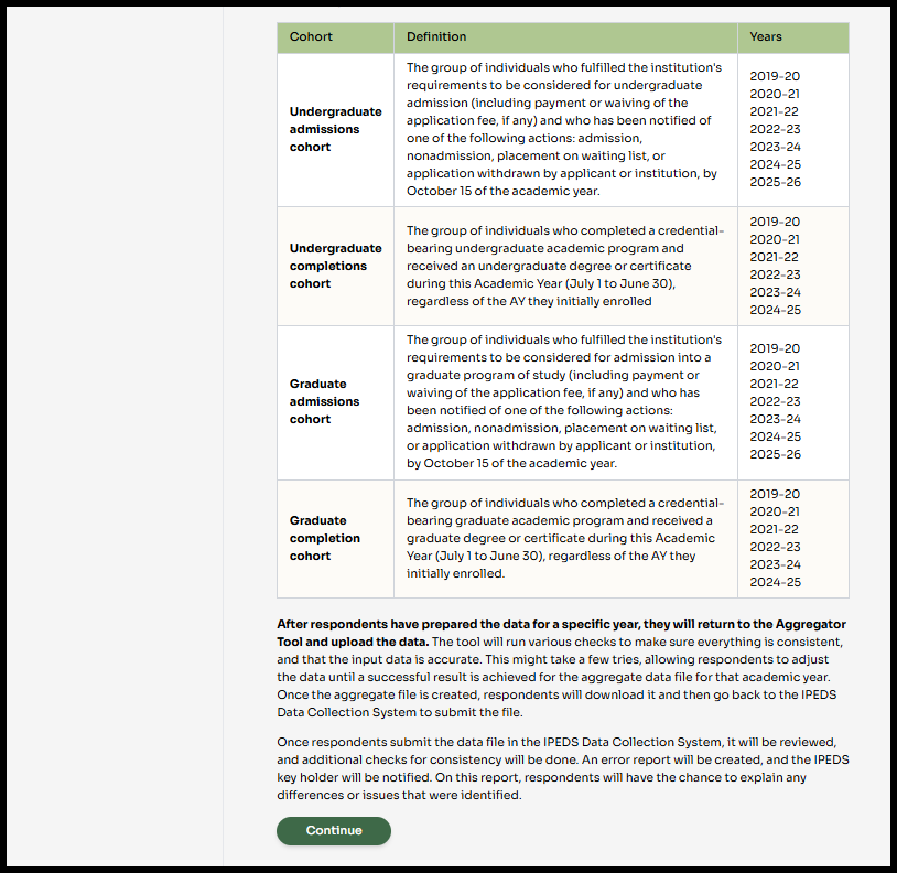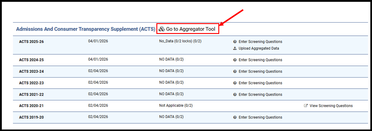 Visit the ACTS Aggregator Tool application and download the data file templates for each academic year for which reporting is required. There will be one file for each academic year (i.e., 2019-20 through 2025-26). Each file will contain tabs for each cohort required for that year (i.e., undergraduate admissions, undergraduate completers, graduate admissions, graduate completers).