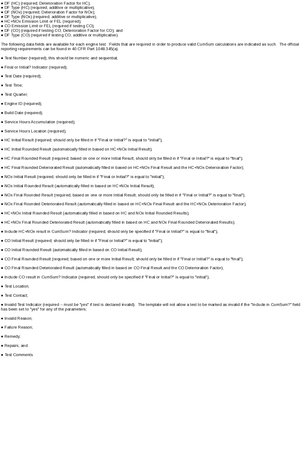 This collection of information is approved by OMB under the Paperwork Reduction Act, 44 U.S.C. 3501 et seq. (OMB Control No. 2060-0338). Responses to this collection of information are mandatory (40 CFR 1048). An agency may not conduct or sponsor, and a person is not required to respond to, a collection of information unless it displays a currently valid OMB control number. The public reporting and recordkeeping burden for this collection of information is estimated to be 12 hours per response. Send comments on the Agency’s need for this information, the accuracy of the provided burden estimates and any suggested methods for minimizing respondent burden to the Regulatory Support Division Director, U.S. Environmental Protection Agency (2821T), 1200 Pennsylvania Ave., NW, Washington, D.C. 20460. Include the OMB control number in any correspondence. Do not send the completed form to this address. |