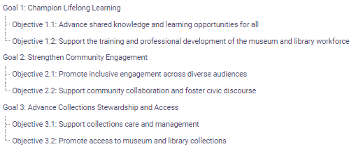 Refer to Section A1 of the Notice of Funding Opportunity for the program to which you are applying. Select the IMLS agency-level goal that best aligns with your proposed project. Once you have selected a goal, select one associated objective.