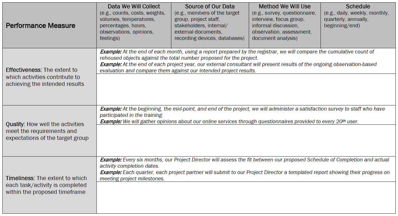 Each applicant is asked to describe how they will monitor and assess their performance in carrying out their project as a whole using these three measures (see Section D2c Item 7).