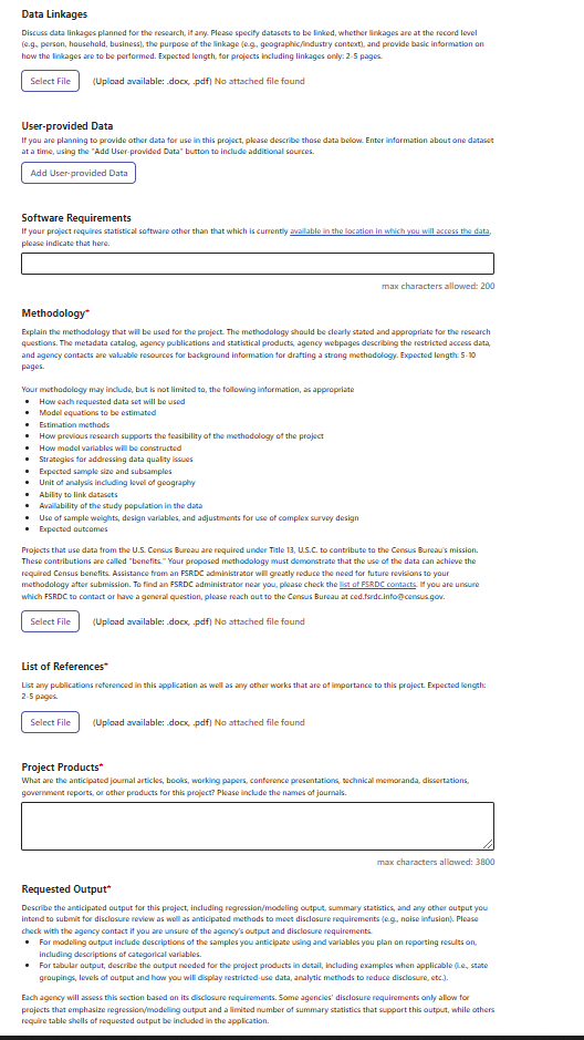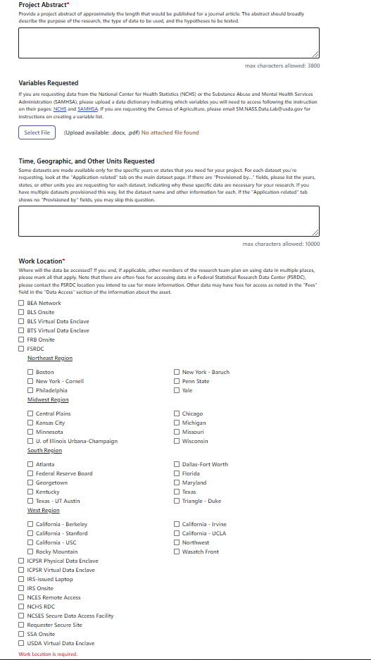 For help in using the application system, please see the User Guide to Applying for Restricted Microdata from the Federal Statistical System.